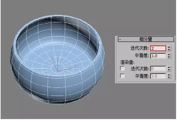 给面盆模型加载一个“网格平滑”修改器,在“细分量”卷展栏中设置“迭代次数”为2,如图所示。