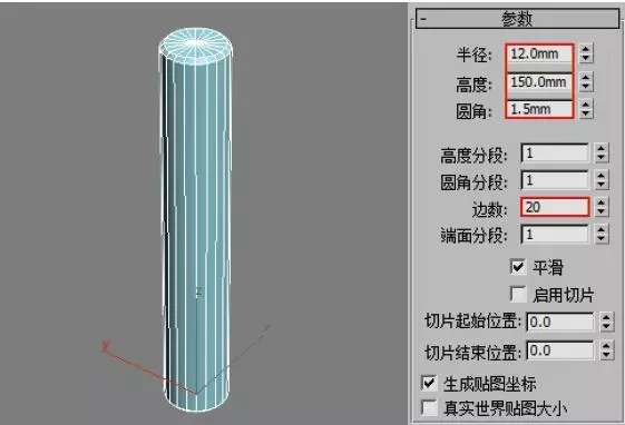 下面制作水龙头模型。使用“切角圆柱体”工具在场景中创建一个切角圆柱体,然后在“参数”卷展栏中设置“半径”为12mm、“高度”为50mm、“圆角”为1.5mm、“边数”为20,如图所示。