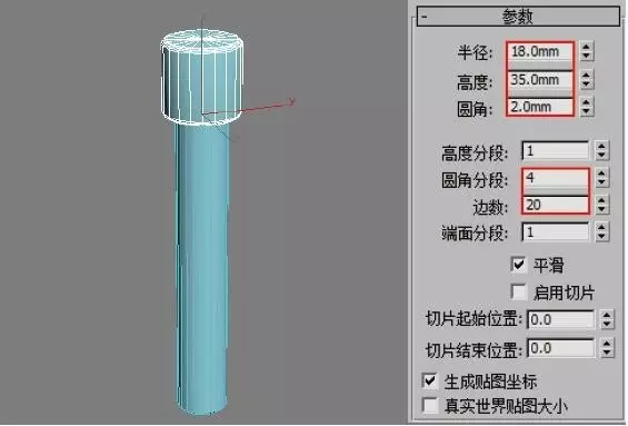 使用“切角圆柱体”工具在场景中创建一个切角圆柱体,然后在“参数”卷展栏中设置“半径”为18mm、“高度”为35mm、“圆角”为2mm、“圆角分段”为4、“边数”为20,其位置及参数如图所示。