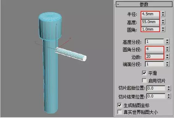 使用“切角圆柱体”工具在场景中创建一个切角圆柱体,然后在“参数”卷展栏中设置“半径”为4.5mm、“高度”为55mm、“圆角”为1mm、“圆角分段”为4、“边数”为20,其位置及参数如图所示。