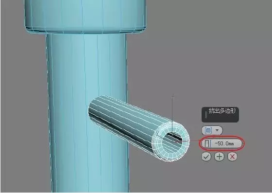 保持选中的多边形不变,然后在“编辑多边形”卷展栏中单击“挤出”按钮后面的“设置”按钮,接着设置“高度”为-50mm,如图所示。