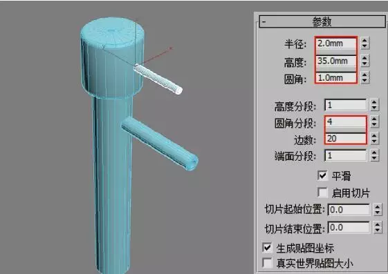 使用“切角圆柱体”工具在场景中创建一个切角圆柱体,然后在“参数”卷展栏中设置“半径”为2mm、“高度”为35mm、“圆角”为1mm、“圆角分段”为4、“边数”为20,其参数及位置如图所示。