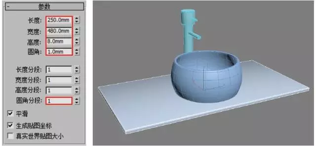 使用“切角长方体”工具在场景中创建一个切角长方体作为台面,然后在“参数”卷展栏中设置“长度”为50mm、“宽度”为480mm、“高度”为8mm、“圆角”为1mm、“圆角分段”为1,如左图所示,洗手池的最终效果如右图所示。