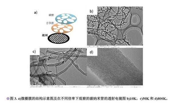 3)微栅膜:为了解决碳支持膜在高分辨观察时的背底问题,可在支持膜上特意制作些微孔,称为微栅膜,通常微栅膜的孔大小不一,孔径为几百纳米到几微米,如图3所示为微栅膜的结构示意图,应用微栅膜负载样品,样品可搭载在孔的边缘,在孔内的部分可实现无背底观察,以提高成像的衬度,由图3 d)可以看出碳纳米管的高分辨像无膜的背底干扰,相比碳支持膜衬度有显著提高。