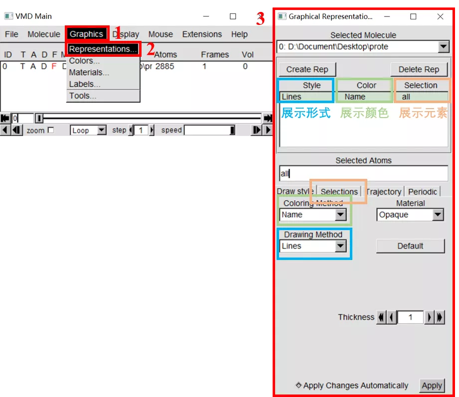 可以通过调整不同分子的展现形式为线状、球棍状或条带状,或者以二级结构、氨基酸类型等为着色方式,以表达分子。