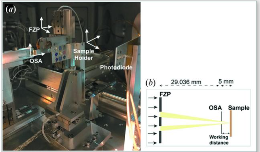 图1.显示所有基本组件的安装原理图:FZP和OSA用作x射线聚焦元件,光电二极管和电子分析仪[1]。