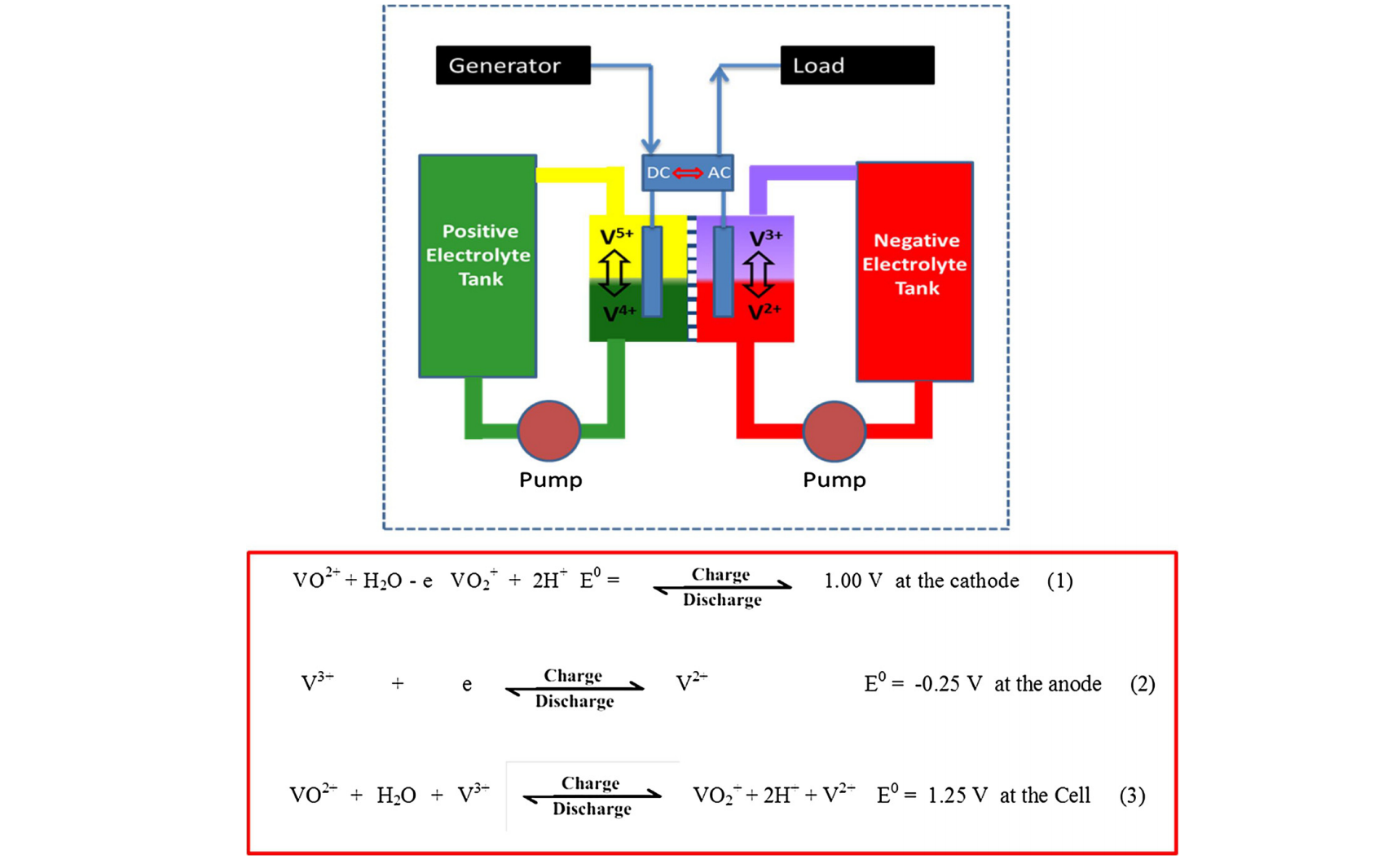 Fig. 1. Schematic diagram of the Vanadium Redox flow battery and the reaction equation during the battery operation[1]
