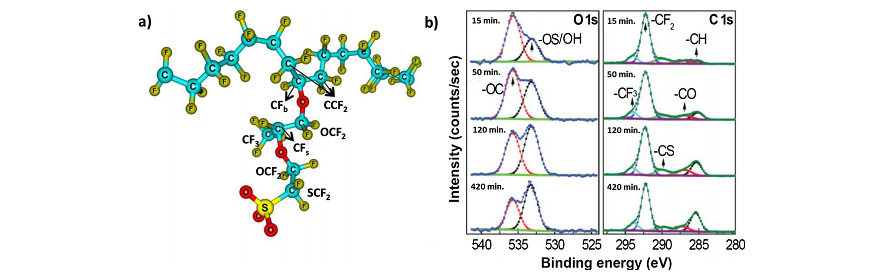 Fig. 2. (a) Schematic diagram of the Nafion Channels, (b) O 1 s and C 1 s X-ray photoelectron spectra from the as-received Nafion membrane as a function of vacuumevacuation time of 15 min, 50 min, 120 min, and 420 mi. [2]