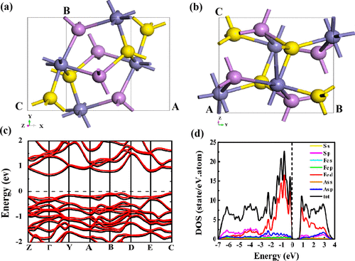 Figure 1. Structure of FeAsS, (a) top view, (b) side view. (c) Calculated band structure with (red line) and without (black line) spin–orbit coupling. (d) Total and partial DOS. The dashed line corresponds to the Fermi level.