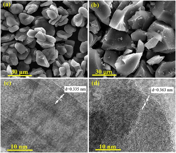 将实验过程制作的样品使用蔡司Crossbeam 340扫描电子显微镜分析仪用于捕获扫描电子显微镜(SEM)图像。TEM图像通过FEI-Tecnai G2F20透射电子显微镜获得。图2显示了PAN硬质碳和石墨样品的SEM和TEM图像。从图2a中可以看出,石墨样品由10–15µm的相对规则的块状颗粒组成,这些颗粒是通过堆叠多个石墨片形成的。