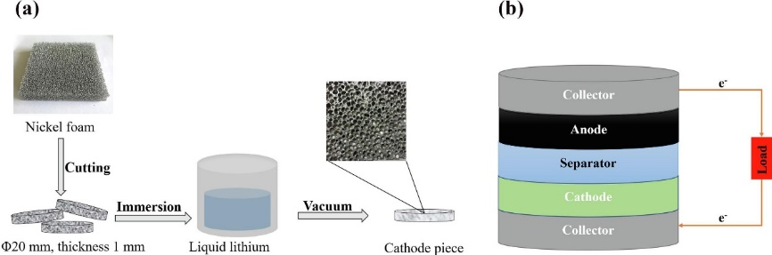 图1 (a) 液态金属阳极制备方法示意图,(b)单个热电池放电试验示意图。[1]