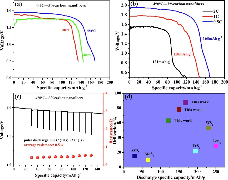 图2 不同温度下0.5 C恒流放电曲线(a)、450℃下不同速率恒流放电曲线(b)、脉冲放电(c)以及(d)PbCl2阴极与硫化物阴极的放电性能比较。[1]