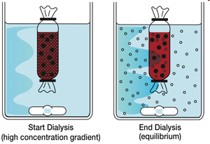 透析就是利用小分子能够通过,而大分子不能够通过半透膜的原理,将大小分子量物质分开的一种实验手段;在膜两侧存在浓度差时,溶质从高浓度的一侧(通常是样品置于透析袋中)扩散通过半透膜到低浓度的一侧(透析溶液一侧)直至膜两边浓度达到平衡。如下图所示: