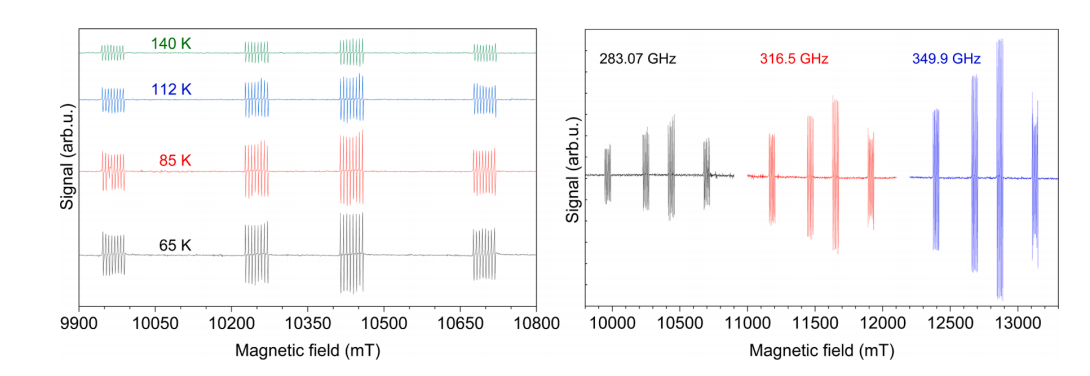 Fig. 1. Temperature dependency of CW-EPR spectra for 4H-SiC:V at 283.07 GHz. The optimal signal was obtained at a temperature range of 65 to 85 K. This is because at lower temperatures, the saturation of the EPR spectra prevented the adequate acquisition of the signal, while at higher temperatures, the reduced difference between the Boltzmann populations of the spin states led to a decrease in signal intensity. RIGHT: CW spectra measured at different microwave frequencies obtained at 125 K. An increase of the signal at higher frequencies is partially due to a higher population difference at higher frequencies and partially because the used EPR probe is optimized for higher frequencies, in this specific case for 430 GHz. 【1】