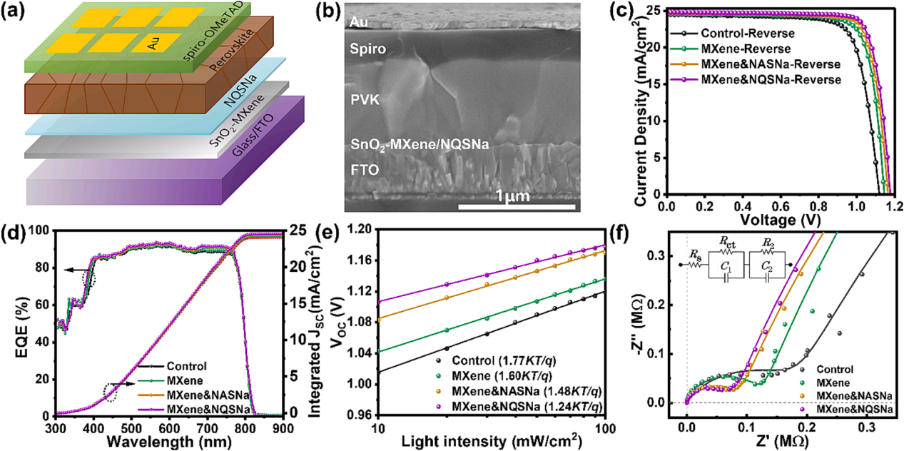 主要研究结论:本研究展示了MXene在钙钛矿太阳能电池中的创新应用。通过MXene纳米片和萘醌磺酸钠盐协同修饰SnO₂基电子传输层,研究人员实现了: