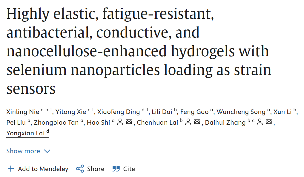 题目:高弹性、抗疲劳、抗菌、导电和纳米纤维素增强水凝胶,以硒纳米颗粒作为应变传感器