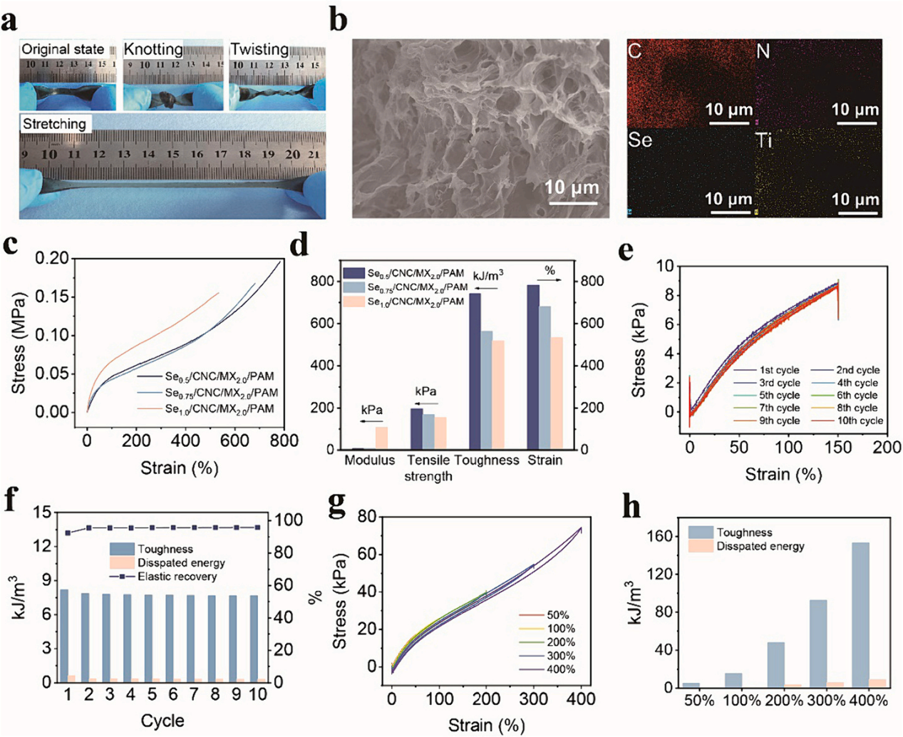 主要研究结论:通过将BioSeNPs、纤维素纳米晶体(CNCs)和MXene引入聚丙烯酰胺网络中,成功制备了一种具有导电性、弹性和抗菌性能的水凝胶。由于BioSeNPs、CNCs和MXene纳米颗粒在能量耗散中的协同作用,展现出: