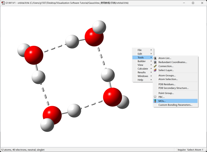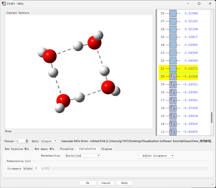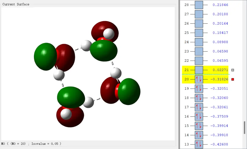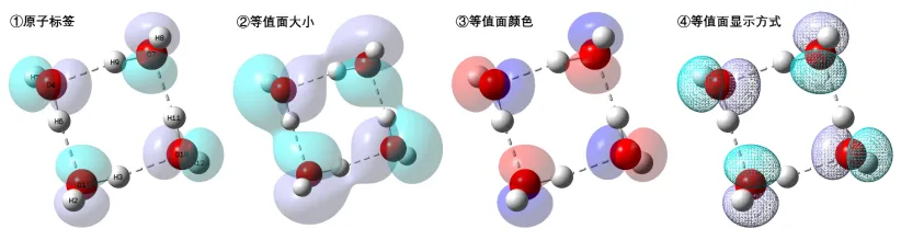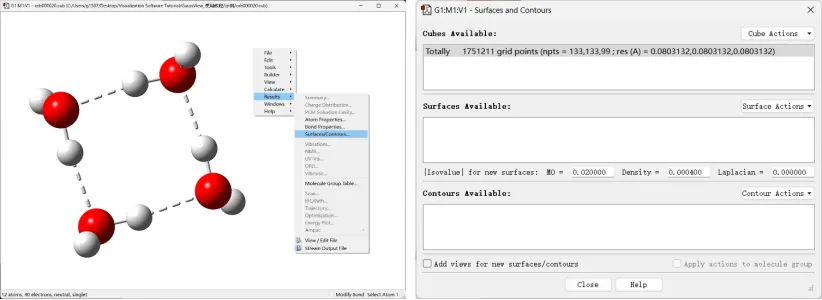 1.以水四聚体的HOMO轨道(20)为例,在GaussView中导入.cub文件,右键打开Results—Surface and Contours窗口