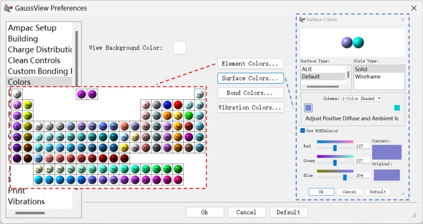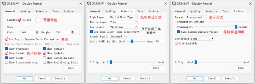 3.1‘Ctrl+D’打开Display Format窗口,在General子对话框设置背景颜色、景深、原子标签等;在Molecule子对话框选择结构呈现形式、原子大小等;在Surface子对话框调整等值面透明度和显示方式
