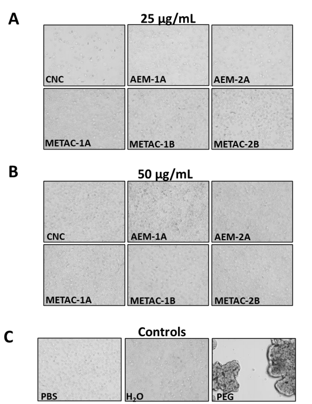 图 1. 未修饰和修饰 CNC 对红细胞形态和聚集的影响。稀释的人血用 (A) 25 µg/mL 或 (B) 50 µg/mL 未修饰和修饰 CNC 处理 2 小时,或用对照 (C) PBS、超纯 H2O 和 1 mg/mL PEG 处理[1]。