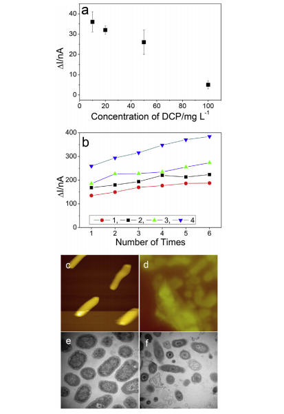 图 1. (a) 仅添加 DCP 作为外源物质的 DI。(b) 通过交替添加 GGA 和 GGA + DCP 进行连续六个周期的毒性测试,1 至 4 表示连续四天的 GGA 信号。新鲜微生物的 AFM 和 TEM 图像(c 和 e),用于毒性测定(d 和 f)[1]。