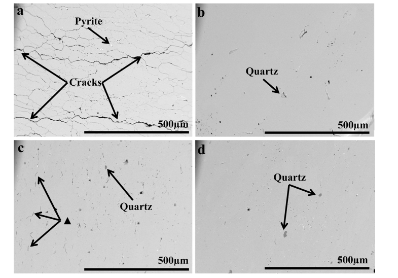图 1. 样品的背散射电子 (BSE) 图像。(a) BN10,(b) NO13,(c) SW20,(d) SW22。EPMA/EDS 表明样品 SW20 中的细小棒状细长浅黑色对比晶粒中存在少量 K、Mg、Ca 和 Si[1]
