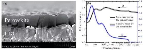图1. (a)制备的钙钛矿薄膜截面SEM图;b)钙钛矿薄膜波长依赖的光学常数实验值(n,k)。[1]