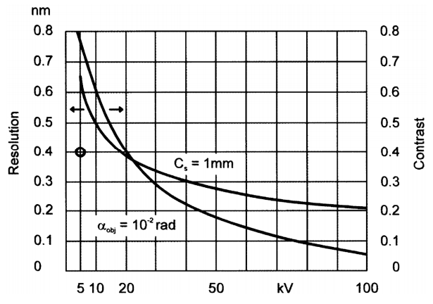 图1 20 nm碳层TEM成像对比度和分辨率与主电子束加速电压的关系。