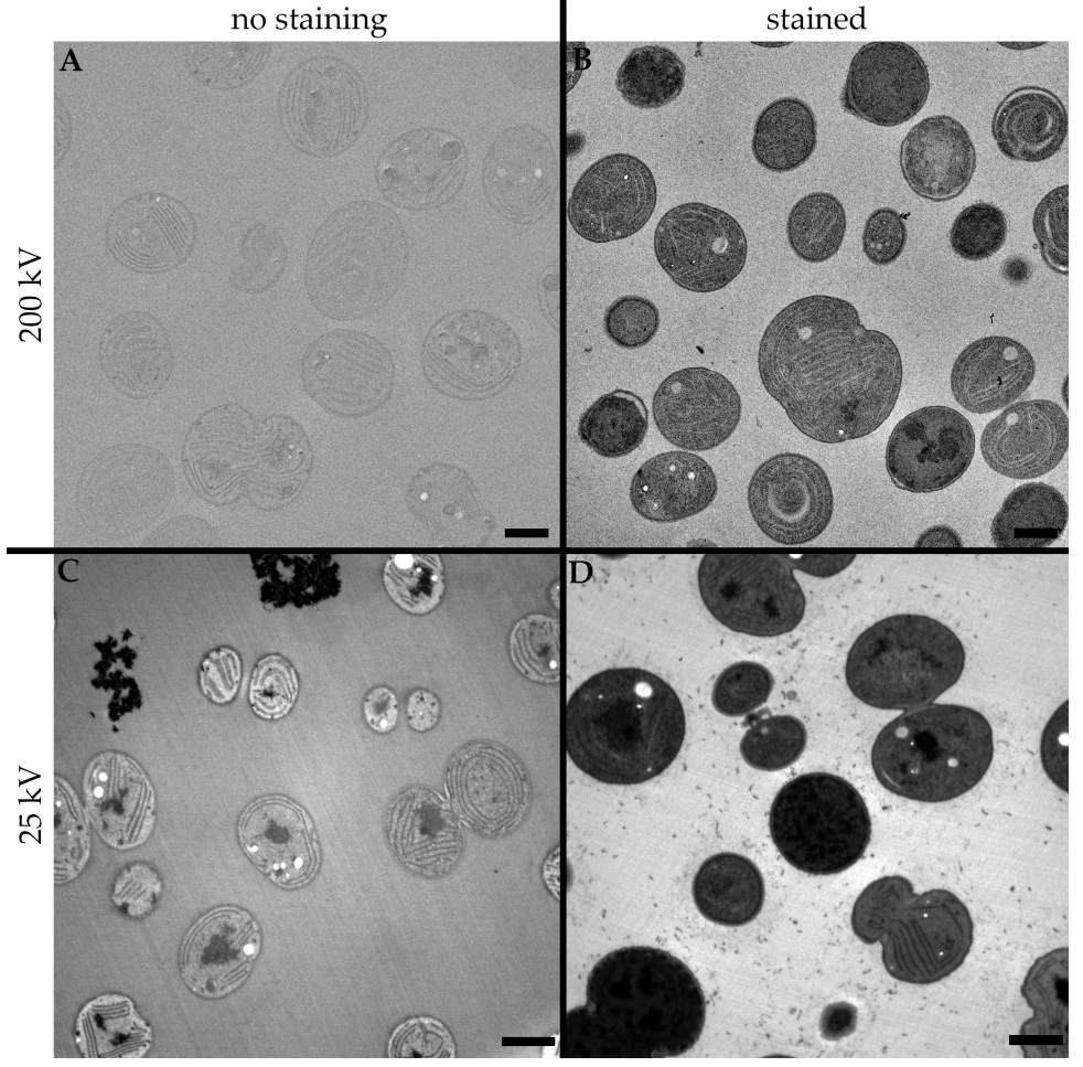 图2 比较不同染色方法及最终透射电镜图像中电子束能量对蓝藻细胞的影响。(A) 200 kV未染色电子束加速电压,(B) 200 kV未染色电子束加速电压,(C) 25 kV未染色电子束加速电压,(D) 25 kV未染色电子束加速电压,(D) 25 kV未染色电子束加速电压,醋酸铀酰和柠檬酸铅染色。