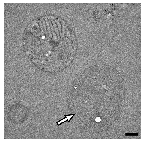 图3 使用200千伏电子束获得的未染色蓝藻细胞的透射电镜图像。箭头标记的类囊体膜。比例尺:500nm。
