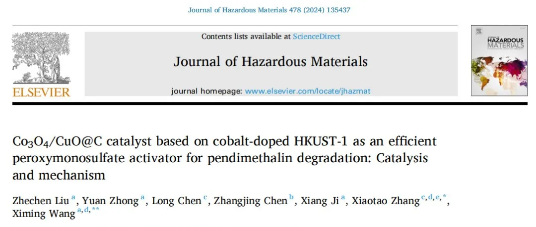 内蒙古农业大学张晓涛教授等人制备了一种低浓度金属离子浸出的Co₃O₄/CuO@C催化剂,用于活化PMS降解二甲戊灵(PM)。通过溶剂热法制备Co@HKUST-1,热解制备Co₃O₄/CuO@C。碳层和双金属的存在减少了金属离子的浸出和提高了PMS的活化效率。3Co₃O₄/CuO@C可高效活化PMS降解PM(98.2%,30min)。随后研究了PM降解的影响因素和Co₃O₄/CuO@C各组分对PM降解的贡献。采用EPR测试和淬灭试验,测试了Co₃O₄/CuO@C活化PMS降解PM体系中存在的活性物种。测试了Co₃O₄/CuO@C在实际水体环境中活化PMS对PM的降解效率。提出了两条PM的降解途径并预测了中间体的生物毒性。最后提出了PM的降解机理。本研究提出了PM降解的新途径,为水体中PM的治理提供了一种新的思路。