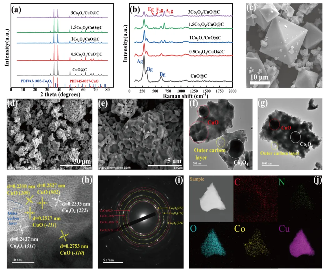 图1. (a) 样品的XRD(X射线衍射)图谱;(b) 样品的拉曼光谱图;(c) Cu-MOF的SEM(扫描电子显微镜)图像;(d,e) 3Co₃O₄/CuO@C的SEM图像;(f,g)3Co₃O₄/CuO@C的TEM(透射电子显微镜)图像;(h)3Co₃O₄/CuO@C的HRTEM(高分辨透射电子显微镜)图像;(i) 3Co₃O₄/CuO@C的选区电子衍射(SAED)图像;(j) 3Co₃O₄/CuO@C中C、N、O、Cu和Co元素的EDS(能量色散X射线光谱)图像。
