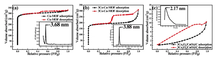 图2. (a) Cu-MOF、(b) 3Co-Cu-MOF 和 (c) 3Co₃O₄/CuO@C 的 N吸附-脱附曲线及孔径分布。