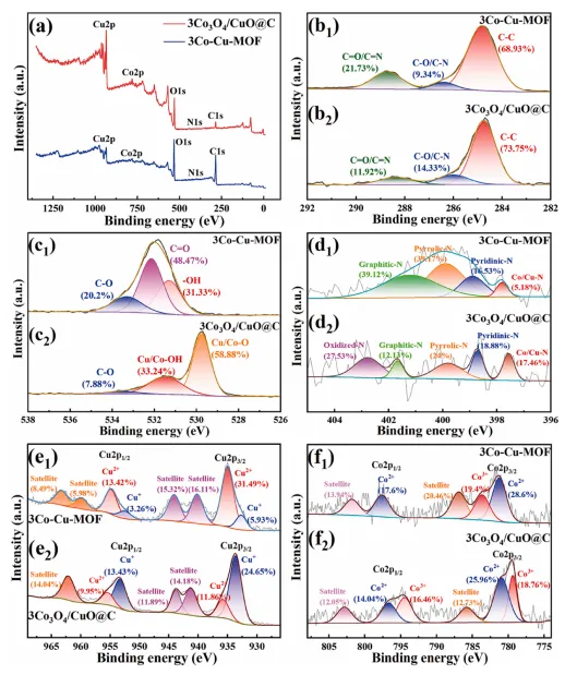 图3. (a) 3Co-Cu-MOF和3Co₃O₄/CuO@C的XPS全谱图。 样品的高分辨率XPS谱图:(b1, b2) C 1s,(c1, c2) O 1s,(d1,d2) N 1s,(e1, e2) Cu 2p,以及(f1, f2) Co 2p。