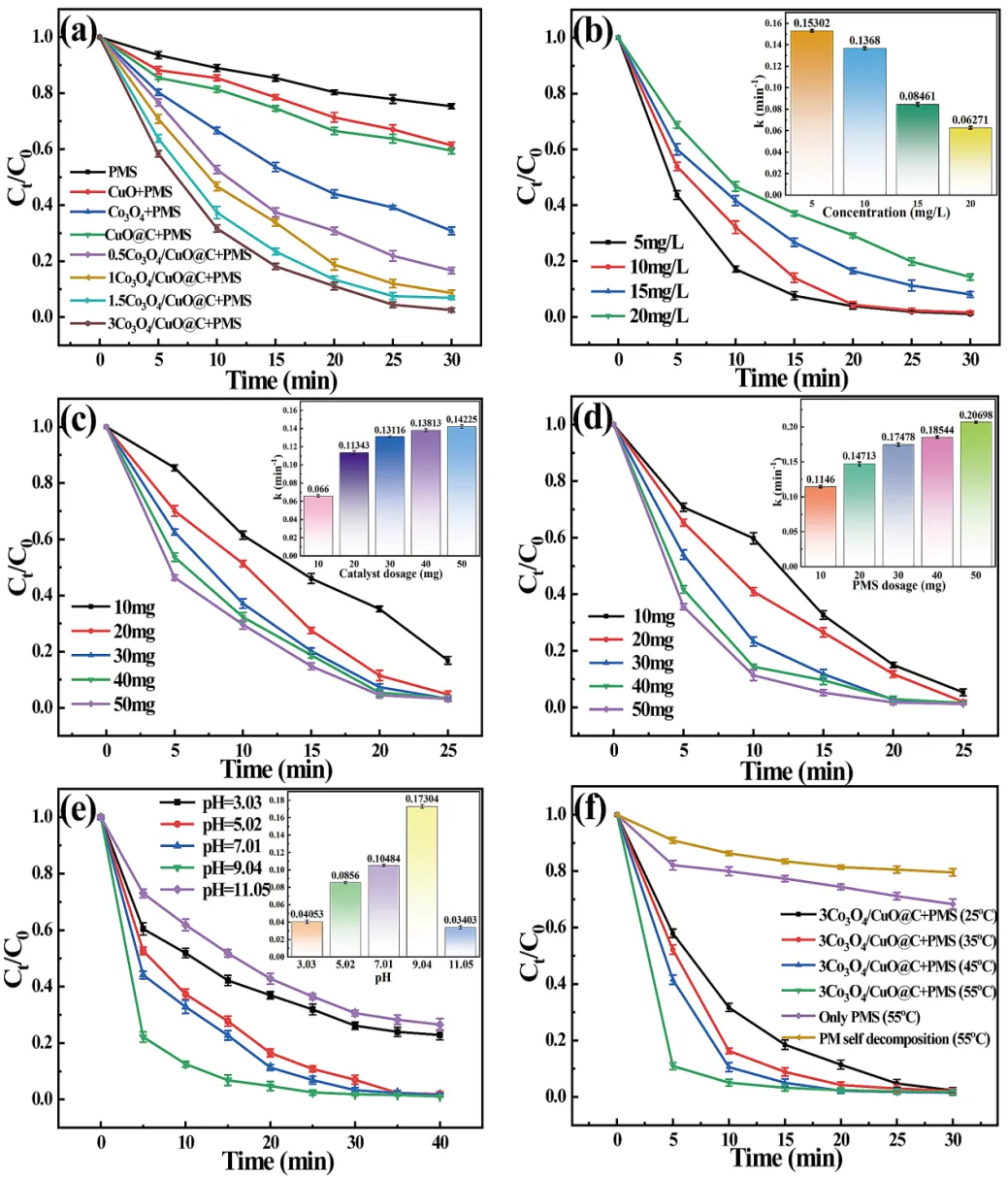 图4. (a) 不同体系在30分钟内的PM去除效率:实验条件为初始PM浓度10 mg/L,体积100 mL,催化剂用量20 mg,PMS用量20 mg,pH值6.8,温度25℃。(b) 初始PM浓度对PM降解效率的影响:实验条件为体积100 mL,3Co₃O₄/CuO@C用量20 mg,PMS用量20 mg,pH值6.8,温度25℃。(c) 催化剂用量对PM降解效率的影响:实验条件为初始PM浓度10 mg/L,体积100 mL,PMS用量20 mg,pH值6.8,温度25℃。(d) PMS用量对PM降解效率的影响:实验条件为初始PM浓度10 mg/L,体积100 mL,3Co₃O₄/CuO@C用量20 mg,pH值6.8,温度25℃。(e) pH值对PM降解效率的影响:实验条件为初始PM浓度10 mg/L,体积100 mL,3Co₃O₄/CuO@C用量20 mg,PMS用量20 mg,温度25℃。(f) 温度对PM降解效率的影响:实验条件为初始PM浓度10 mg/L,体积100 mL,3Co₃O₄/CuO@C用量20 mg,PMS用量20 mg,pH值6.8。