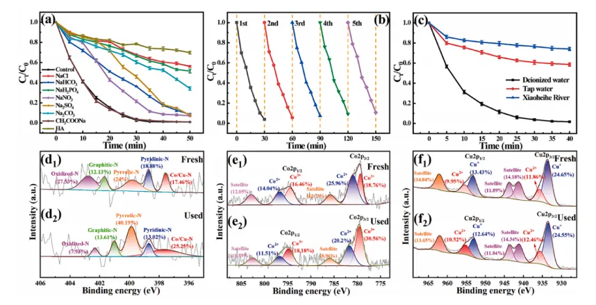 图5. (a) 不同无机离子和HA对PM降解的影响;实验条件:初始PM浓度为10 mg/L,体积为100 mL,3Co₃O₄/CuO@C用量为20 mg,PMS用量为20 mg,pH值为6.8,温度为25℃,NaCl、NaHCO₃、NaH₂PO₄、NaNO₃、Na₂SO₄、Na₂CO₃和CH₃COONa的浓度均为5 mM,HA用量为20 mg。(b) 3Co₃O₄/CuO@C的重复使用性能;实验条件:初始PM浓度为10 mg/L,体积为100 mL,催化剂用量为20 mg,PMS用量为20 mg,pH值为6.8,温度为25℃。(c) 3Co₃O₄/CuO@C活化PMS在不同环境中对PM的降解曲线;实验条件:初始PM浓度为10 mg/L,体积为100 mL,3Co₃O₄/CuO@C用量为20 mg,PMS用量为20 mg,pH值为6.8,温度为25℃。(d) 使用前和使用后的3Co₃O₄/CuO@C复合材料的高分辨率XPS光谱:N 1s;(e) Co 2p;(f) Cu 2p。