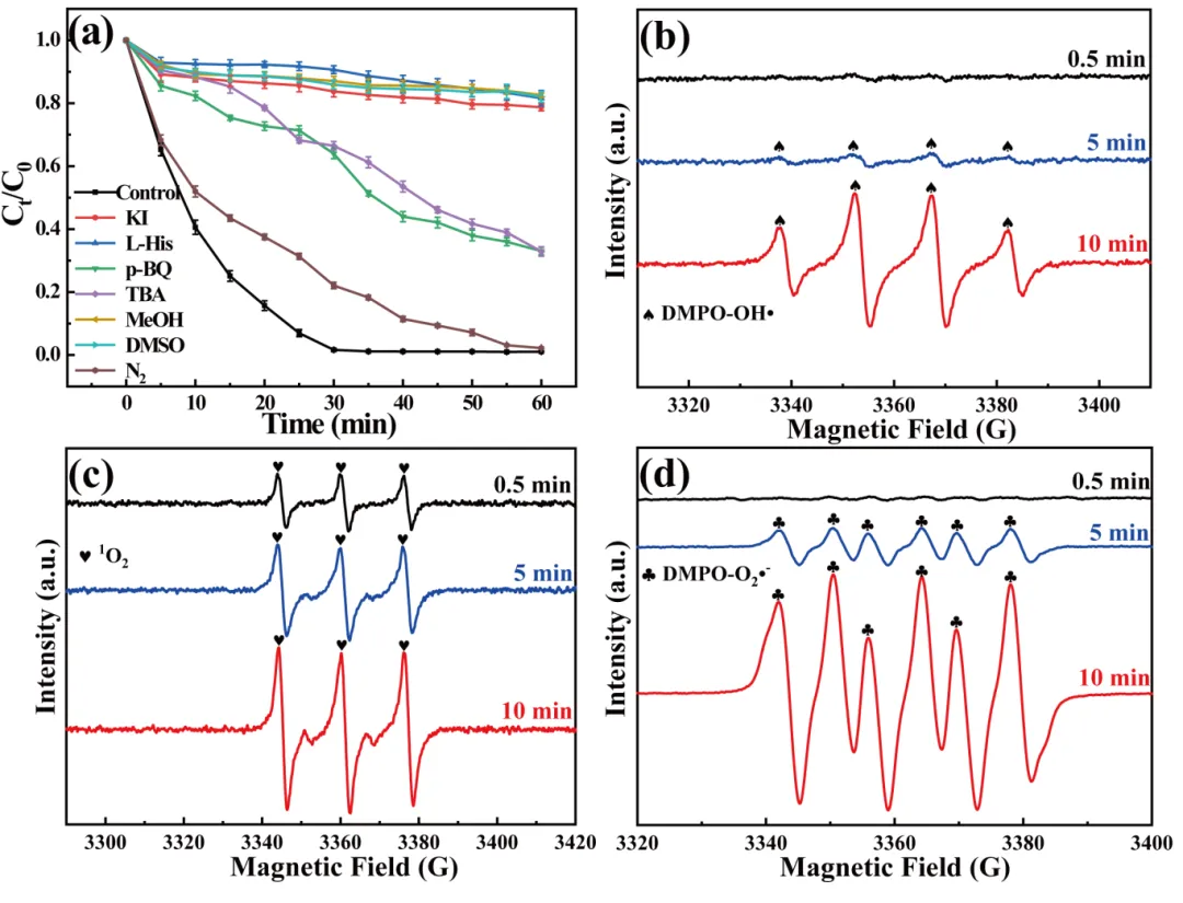 图6. (a) 不同清除剂对通过3Co₃O₄/CuO@C活化PMS去除PM的影响;实验条件:初始PM浓度为10 mg/L,体积为100 mL,催化剂用量为20 mg,PMS用量为20 mg,pH值为6.8,KI、L-his和p-BQ用量为2 mM,TBA、MeOH和DMSO用量均为50 mM,温度为25℃。(b) 使用DMPO捕获OH•和SO₄•-。(c)使用TEMP捕获¹O₂(d) 使用DMPO捕获O₂•-