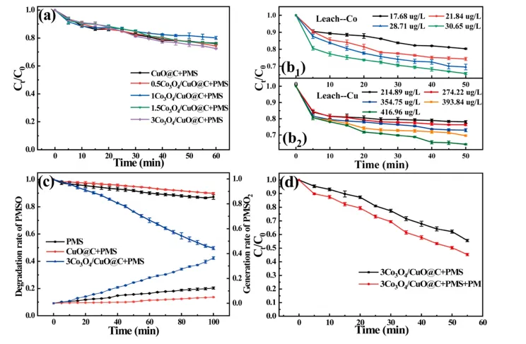 图7. (a) 使用KSCN对金属离子进行淬灭对催化剂降解PM的影响;实验条件:初始PM浓度为10 mg/L,体积为100 mL,催化剂用量为20 mg,PMS用量为20 mg,pH值为6.8,温度为25℃,KSCN用量为2 mM。(b) 催化剂中的浸出金属离子活化PMS对PM的降解效率;实验条件:初始PM浓度为10 mg/L,体积为100 mL,PMS用量为20 mg,pH值为6.8,温度为25℃。(c) 体系中PMSO的降解速率和PMSO₂的生成速率;实验条件:初始PMSO浓度为60 mg/L,体积为100 mL,催化剂用量为20 mg,PMS用量为20 mg,温度为25℃。(d) PM对PMS分解速率的影响;实验条件:初始PM浓度为10 mg/L,体积为100 mL,催化剂用量为20 mg,PMS用量为20 mg,温度为25℃。