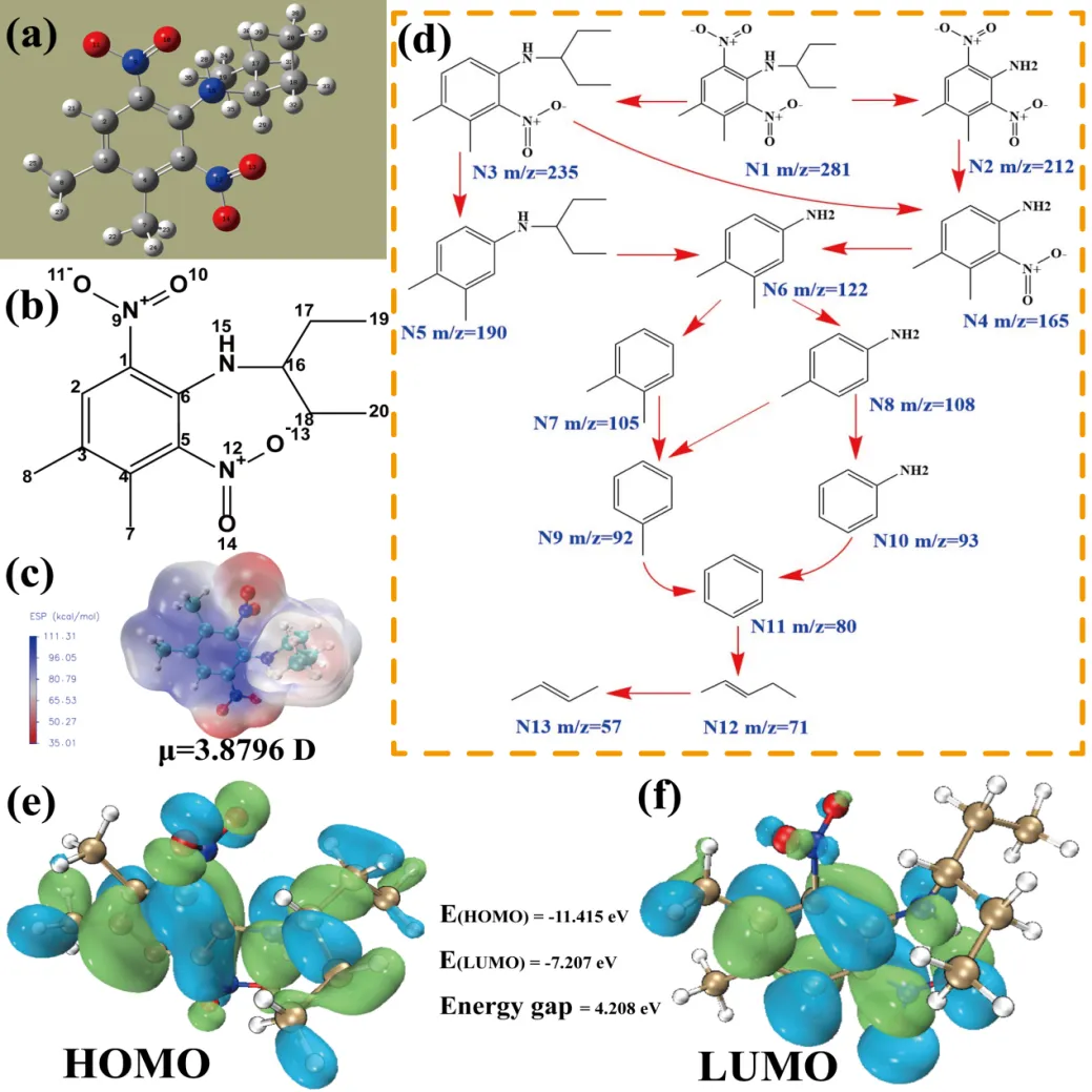 图8. (a) PM的三维结构优化;(b) 结构式及原子标记;(c) 静电势分布;(d)可能降解路径及中间产物;(e) 最高占据分子轨道(HOMO);(f)最低未占分子轨道(LUMO)。