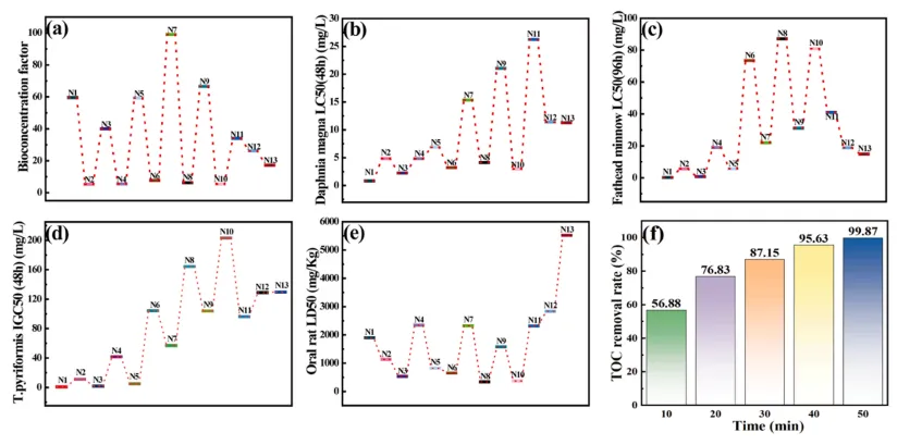 图9. 中间产物的危害分析:(a) 生物富集系数;(b) D. magna LC50(48小时);(c) fathead minnow LC50(96小时);(d) T. pyriformis IGC50(48小时);(e) oral rat LD50。(f) 总有机碳(TOC)去除率;实验条件:初始PM浓度为10 mg/L,体积为100 mL,3Co₃O₄/CuO@C用量为50 mg,PMS用量为50 mg,pH值为6.8,温度为25℃。