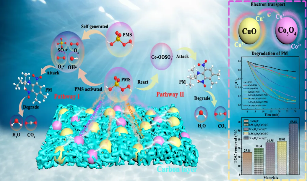 二甲戊灵(PM)是一种二硝基苯胺类除草剂,用于控制作物中的阔叶杂草。它通过抑制植物细胞分裂和细胞壁的形成发挥作用。PM是一种潜在的人类致癌物(C组)。尽管欧盟已批准将PM用于农业,但PM对鱼类和其他小型水生生物具有长期毒性。美国环境保护局已将PM列为“有毒污染物”。目前,PM系统性的降解研究较少,其降解途径还有待深入探究。此外,迫切需要一种高效的方法来降解PM。过渡金属活化PMS的高级氧化技术是一种很有前途的降解水体中有机污染物的方法。因此,本研究开发了一种Co@HKUST-1热解制备Co₃O₄/CuO@C活化PMS降解PM的方法。旨在通过金属氧化物和碳层来减少金属离子的浸出,同时高效活化PMS快速降解PM。