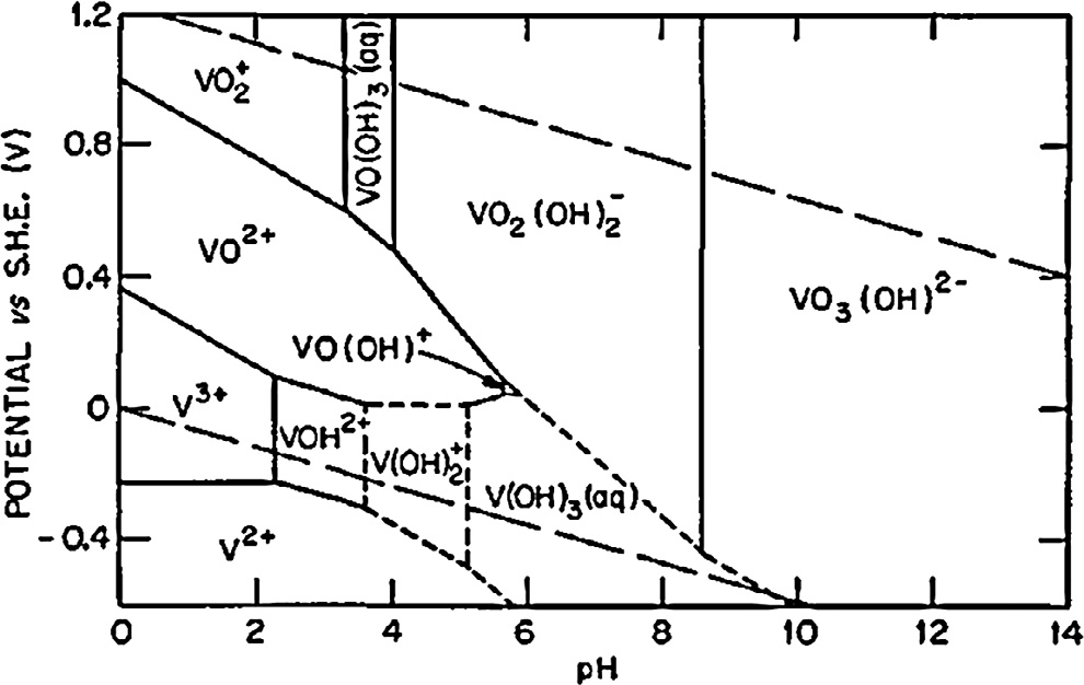 图1. 钒的形态用pH值与氧化还原电位的关系图来表示。[1]