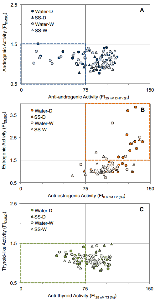 图1 在干燥季节和湿润季节收集的水和SS样品中(A)雄激素和抗雄激素(B)雌激素和抗雌激素(C)甲状腺样和抗甲状腺活性之间的关系。