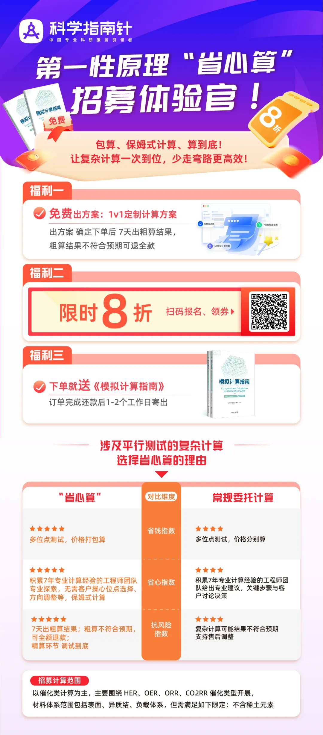 【摘要】 科学指南针提供‘第一性原理·省心算’服务,帮助科研人员简化计算流程,包括免费定制方案、7天快速出粗算结果、限时8折优惠、退款保障和赠专业指南书,旨在实现省心、省力、省钱的科研计算。