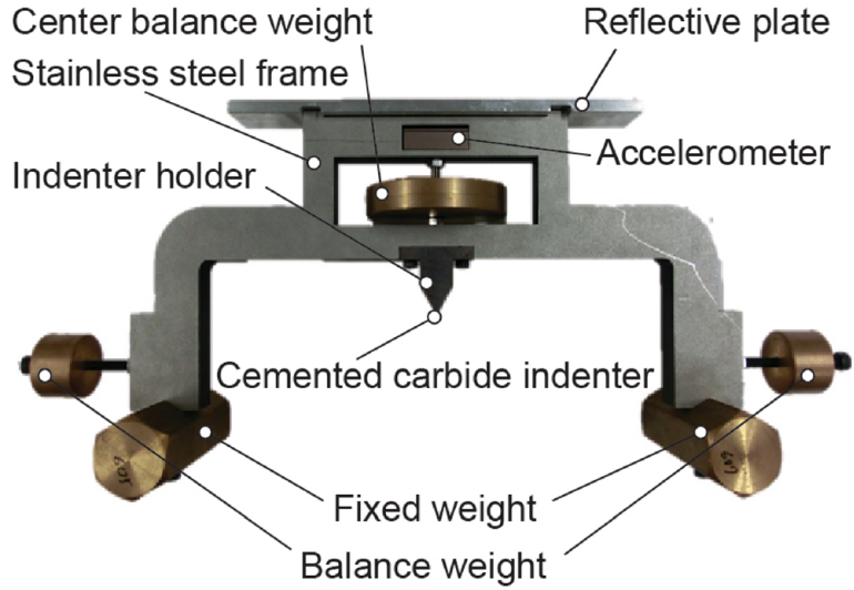 为了验证这一方案,我们开发了原型设备。图1展示了装有小型无线加速度计的赫伯特钟摆实物照片。该摆锤由不锈钢框架构成,关键组件包括:两个固定黄铜砝码、左右及中心黄铜平衡砝码、SK3高碳钢压头架、硬质合金柱状压头(直径2mm,长度4mm)以及铝制反射镜。加速度计安装在摆锤中心,采样频率范围为0.1~1600Hz,确保数据采集灵活性。