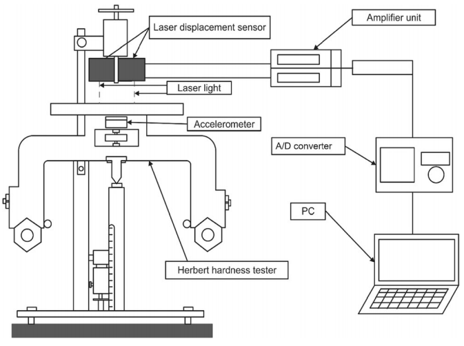 最近,R.Suzuki等人对赫伯特硬度计进行了创新改进。他们通过在赫伯特摆上安装紧凑型无线加速度计(AccStick6, SysCom),实现了高精度摆角检测。这一设计显著提升了便携性,同时避免了传统激光位移传感器的笨重问题。加速度计技术已在机器人姿态控制中广泛应用,通过加速度曲线计算梯度角,精度可靠。此外,添加无线通信模块支持远程数据传输,扩展了测试场景。