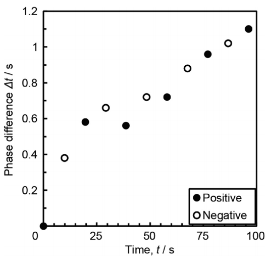图3 加速度计和两个激光位移传感器测量的摆角正负峰值之间的相位差