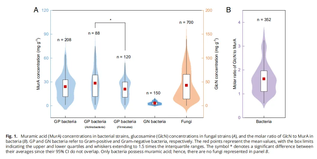 • 结果B​:放线菌门(28.4 mg/g)的MurA浓度明显高于厚壁菌门(20.9 mg/g)。
