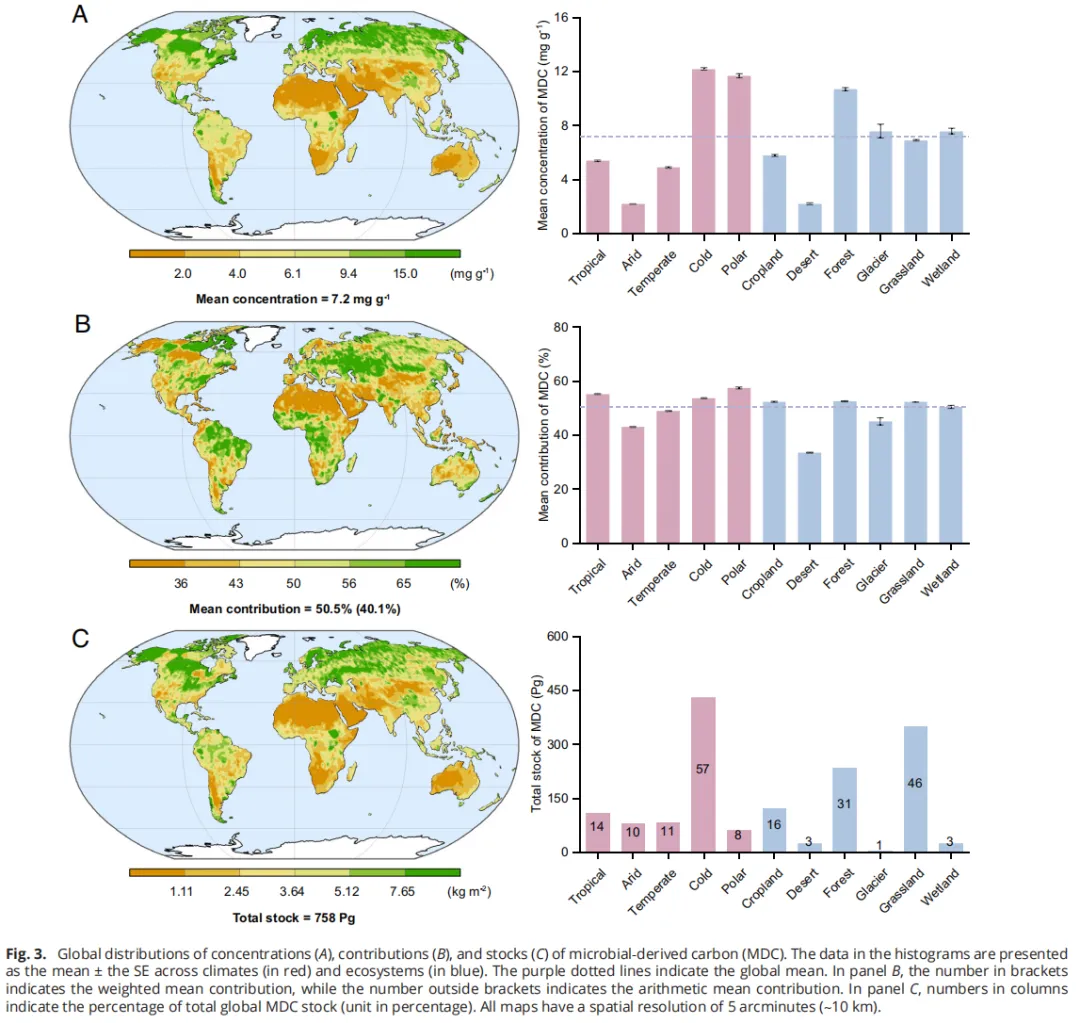 图3: 全球微生物衍生碳(MDC)的分布、贡献与储量