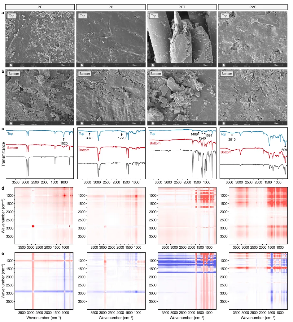 Fig.2:扫描电子显微镜图像(a, 顶部;b, 底部)、傅里叶变换红外(FTIR)光谱(c),以及不同聚合物FTIR光谱的二维相关谱分析(d, 同步;e, 异步)